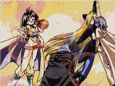 Point number seven: (donated by Mizel-san) In the first episode of Slayers Try. Lina is fighting Filia, in her Gold Dragon form. She fires a dragon slave at Filia and everyone thinks the dragon has been destroyed. Zel is telling Lina the dragon didn't have a chance and in that scene Goury has his hand on Zel's shoulder. When, they suddenly see the tsunami created by Lina's dragon slave, they grab hands and wrap their arms around each other and freak out