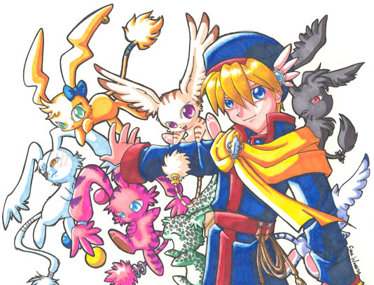 Posted: 01-09-04 Medium: prismamarker Comments: I drew this to sell at Ushicon, which didn't go very well in terms of sales. It's a random anime guy with a horde of these bunny things. ::drained:: This thing took me about two days to do because of all the detail. I apoligize for shrinking it too much. |