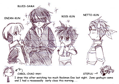 Posted: 02-14-03 Comments: Gah! I finally got to see Enzan in Rockman.exe but he's SUCH a jerk! He needs an uke! ::eyes Netto-kun:: ::hands Netto a "Glomp" chip":: "Here, kid! It's really powerful! Have your navi use it on his navi! Nyoh hoh hoh hoh hoh!" XD Net: "Um...okay..." O__o; "Glomppu chip! Slotto IN!" Rockman.Exe: ::is powered up:: "Um..." ::starts feeling really weird, twitches a little:: Enzan & Blues.Exe: ??? Rockman.Exe: "I LOVE YOU!" ::GLOMP-tackles Blues.Exe:: Blues.Exe: O___O!!!!! CRASH! Enzan & Net: o___O;;; Rockman.Exe: ::cuddling against Blues.Exe:: =^_______^= Blues.Exe: @______@ |